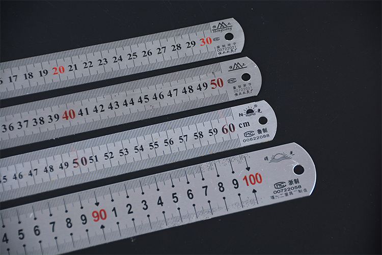 使用方法:测量前检查是否”0”刻度磨损,整体弯曲变形。测量时尺子和被测物要放在同一平面上,且尺子与被测物保持垂直不歪斜,读数时要正视。