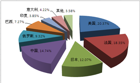 国际市场主要分布于美国、法国、中国、日本、俄罗斯五个国家。