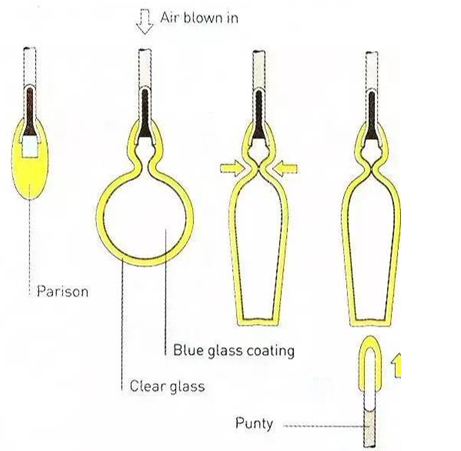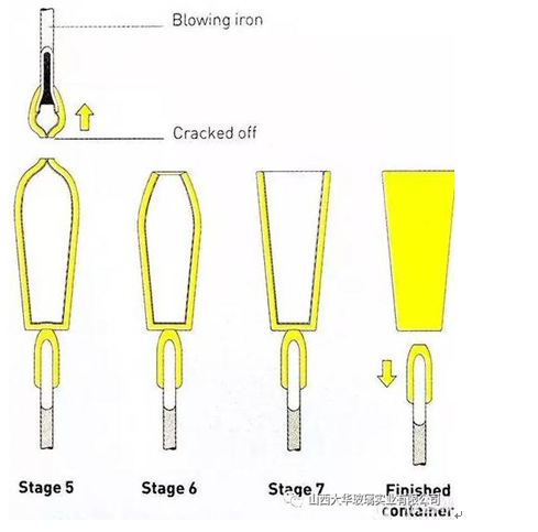 步骤5-8:可无模自由吹制,完成塑形后,割开空心铁管和成品的衔接部分,最后从吹管上敲落,使其冷却成型。