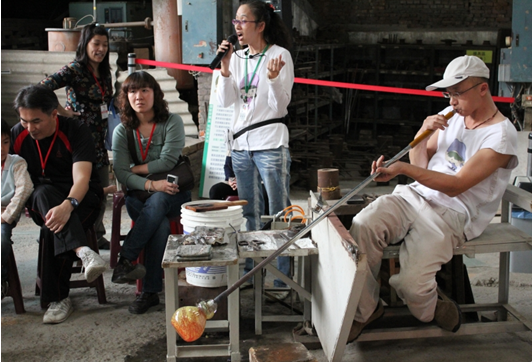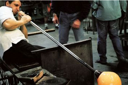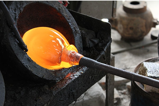 人工口吹玻璃看似简单却包含工匠复杂的技艺体现。工匠手持一条长约1.5M的空心铁管。一端首先从炉中蘸取玻璃液(挑料),而一端是吹嘴,也就是人工需要费心思的地方。首先,挑料后在滚料板(碗)上来回滚均匀。其次,向里吹气,产生玻璃料泡,可以在摸中吹成制品,也可无模任由工匠吹制,最后是从吹管上敲落。冷却后便成型了。