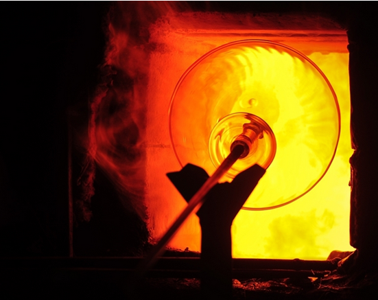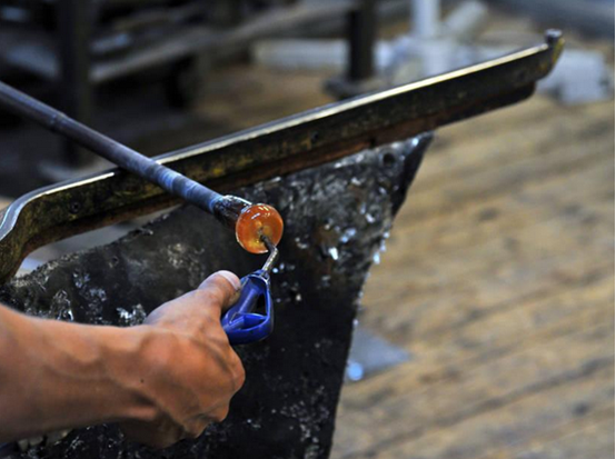 第五步;抻挺。将杯身下面粘的料高温烘烤抻拉出杯挺。这一步全凭“目测”经验来制作,不使用标尺,这是人工吹制和机制的最大区别。