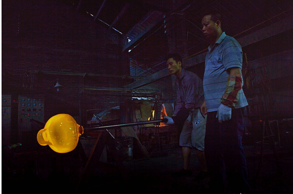 第二步;吹制工人通过挑料杆吹出一个玻璃料泡,俗称吹小泡。